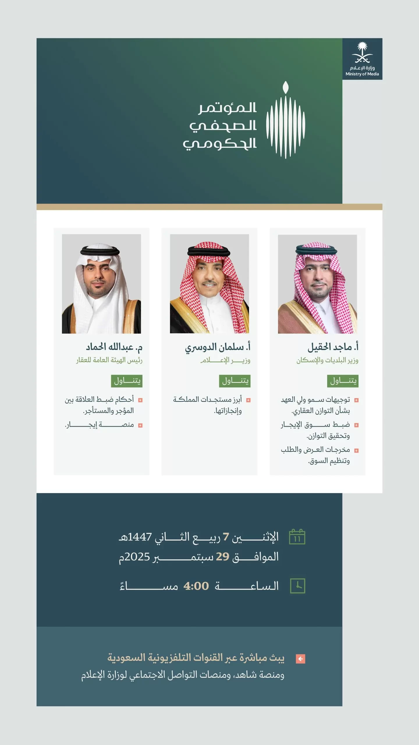 ينعقد المؤتمر الصحفي الحكومي يوم الاثنين 29 سبتمبر 2025، الذي يستضيف معالي وزير البلديات والإسكان الأستاذ ماجد بن عبدالله الحقيل؛ للحديث عن رؤية القيادة ومنطلق التوازن العقاري، وتوجيهات صاحب السمو الملكي الأمير محمد بن سلمان بن عبدالعزيز آل سعود ولي العهد رئيس مجلس الوزراء -حفظه الله- بشأن التوازن العقاري، وضبط سوق الإيجار وتحقيق التوازن، ومخرجات العرض والطلب وتنظيم السوق، والشفافية والموثوقية ركيزةً للنمو.