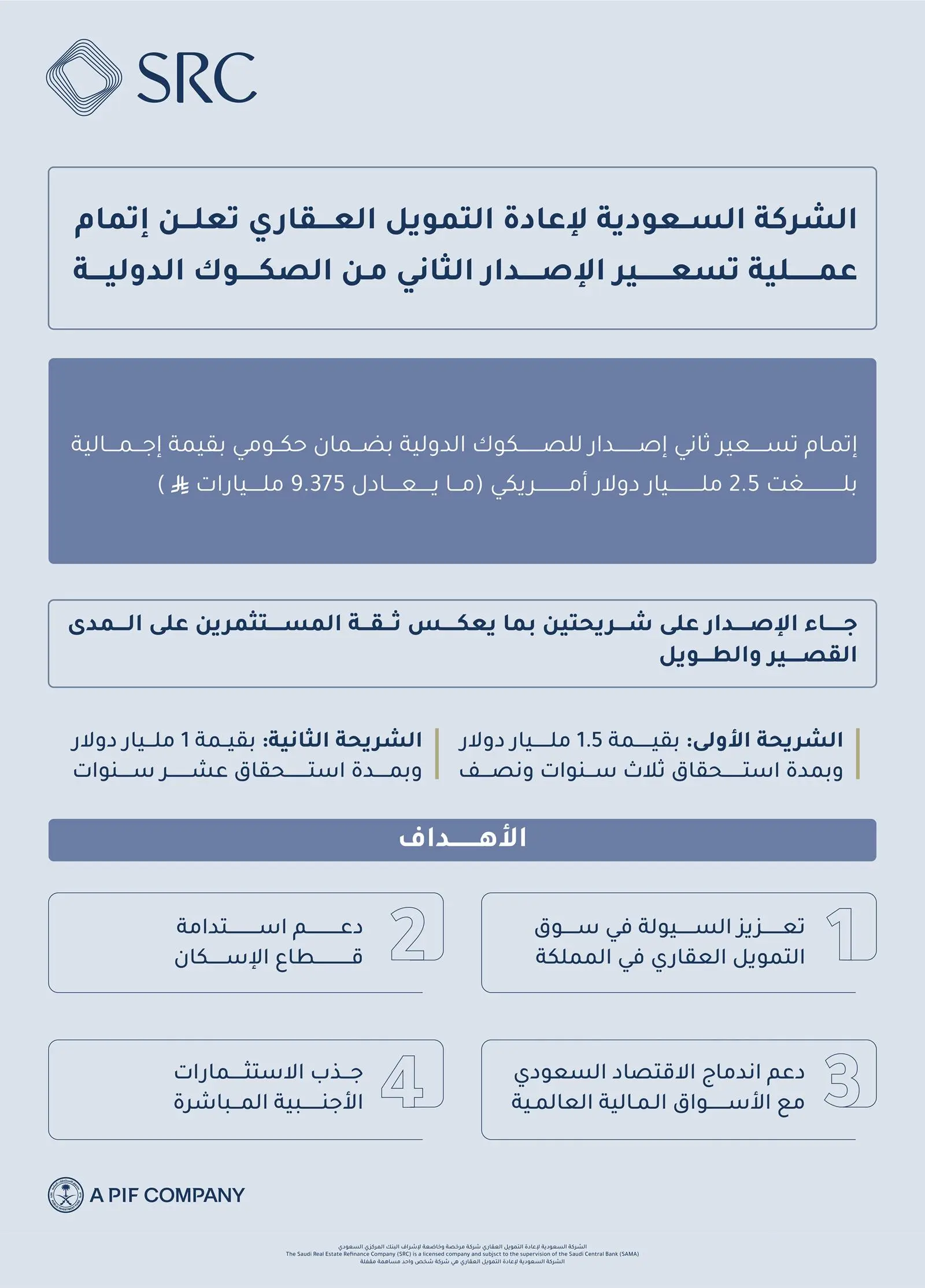 أعلنت الشركة السعودية لإعادة التمويل العقاري -إحدى شركات صندوق الاستثمارات العامة- عن نجاح تسعير الإصدار الثاني من الصكوك الدولية بضمان حكومي، بقيمة إجمالية بلغت (2.5) مليار دولار، ليُعد ذلك الإصدار الأكبر للشركة منذ تأسيسها، حيث جاء الإصدار على شريحتين: الأولى بقيمة (1.5) مليار دولار بأجل استحقاق (3) سنوات ونصف، والثانية بقيمة مليار دولار بأجل استحقاق (10) سنوات.