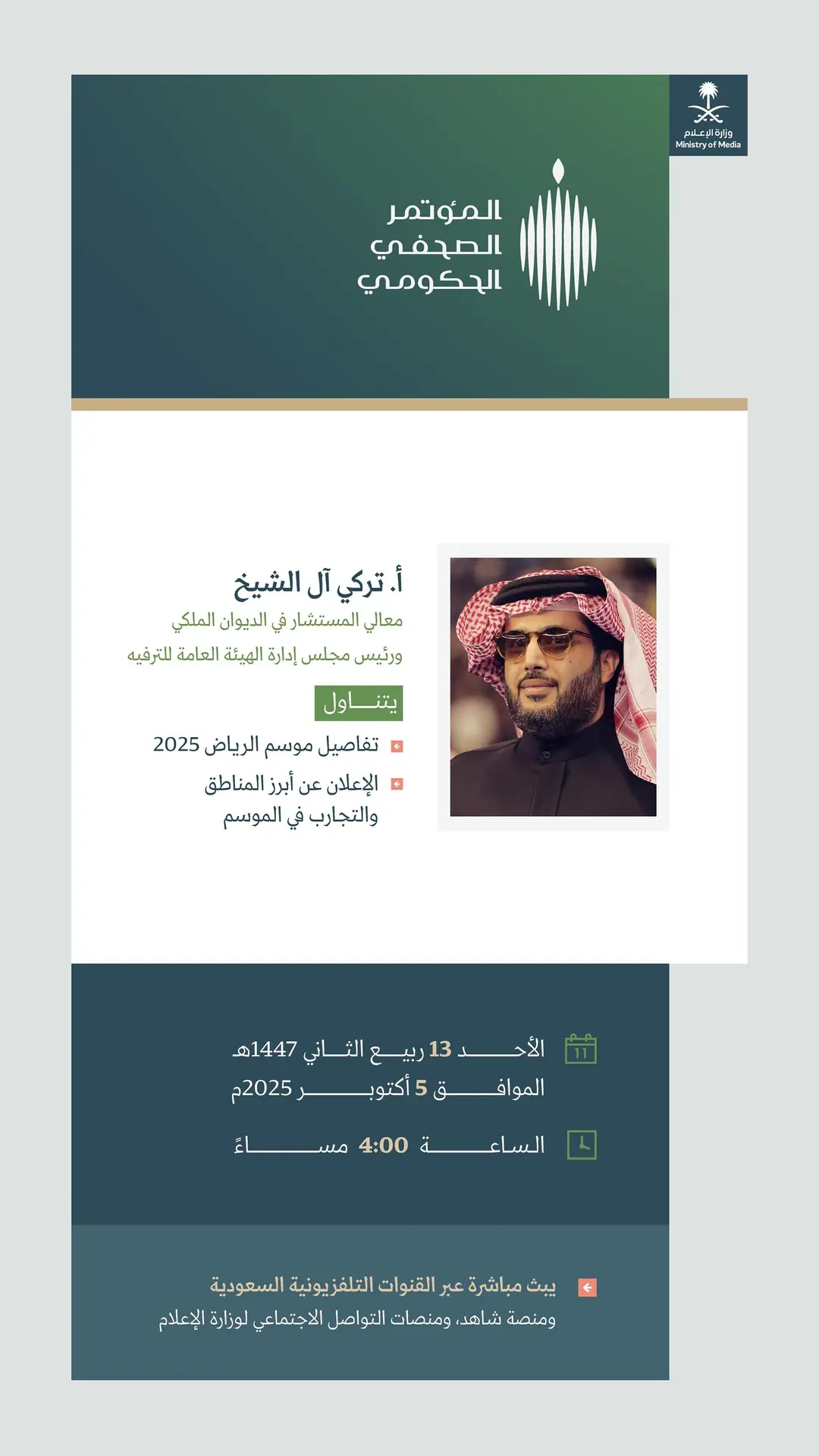 ينعقد المؤتمر الصحفي الحكومي يوم الأحد 5 أكتوبر 2025، الذي يستضيف معالي المستشار في الديوان الملكي، رئيس مجلس إدارة الهيئة العامة للترفيه الأستاذ تركي بن عبدالمحسن آل الشيخ؛ للحديث عن تفاصيل موسم الرياض 2025 والإعلان عن أبرز المناطق والتجارب في الموسم.
