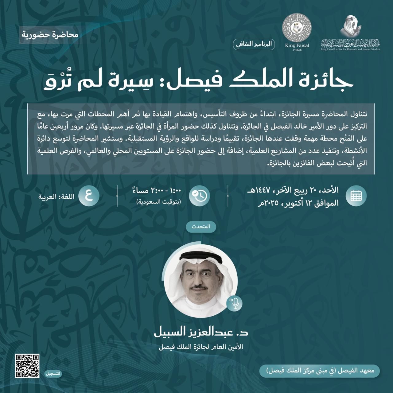 يُنظّم مركز الملك فيصل للبحوث والدراسات الإسلامية ضمن برامج المركز الثقافي، وبالتعاون مع جائزة الملك فيصل، محاضرة حضورية بعنوان”جائزة الملك فيصل: سيرة لم تُرْوَ”، يقدمها سعادة الدكتور عبدالعزيز السبيّل، الأمين العام لجائزة الملك فيصل، وذلك يوم الأحد 12 أكتوبر 2025، في معهد الفيصل بمبنى مركز الملك فيصل للبحوث والدراسات الإسلامية بالرياض، في تمام الساعة الواحدة مساءً.