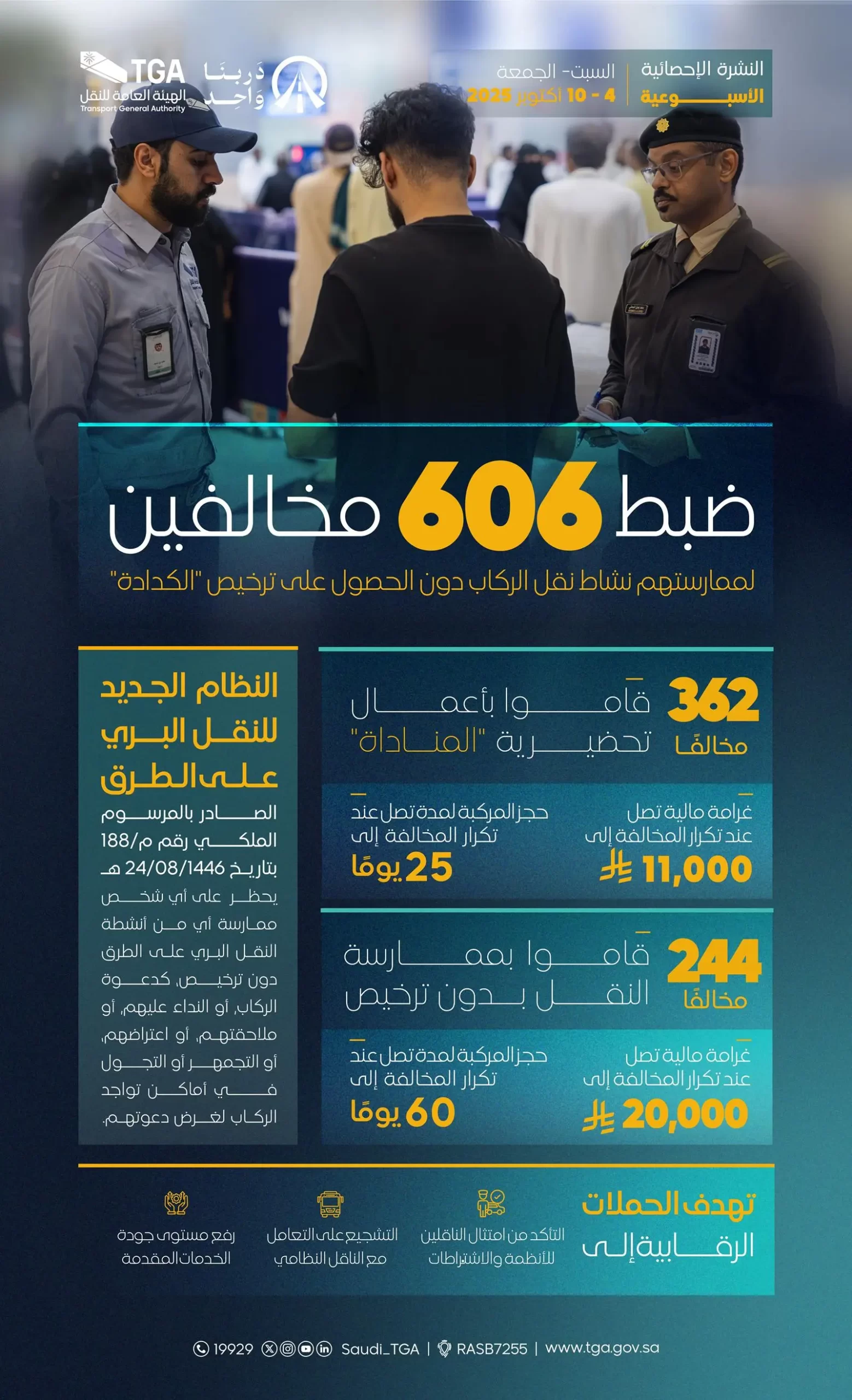 واصلت الفرق الرقابية في الهيئة العامة للنقل جولاتها التفتيشية، وضبطت خلال الفترة من السبت حتى الجمعة الموافق 4 – 10 أكتوبر الجاري، 606 مخالفين، أوقعت بحقهم الإجراءات النظامية التي تتضمن حجز المركبات وغرامات مالية؛ لممارستهم نشاط نقل الركاب دون الحصول على ترخيص “الكدادة”، وذلك في مختلف مناطق المملكة، بالتعاون مع عدد من الجهات المعنية.