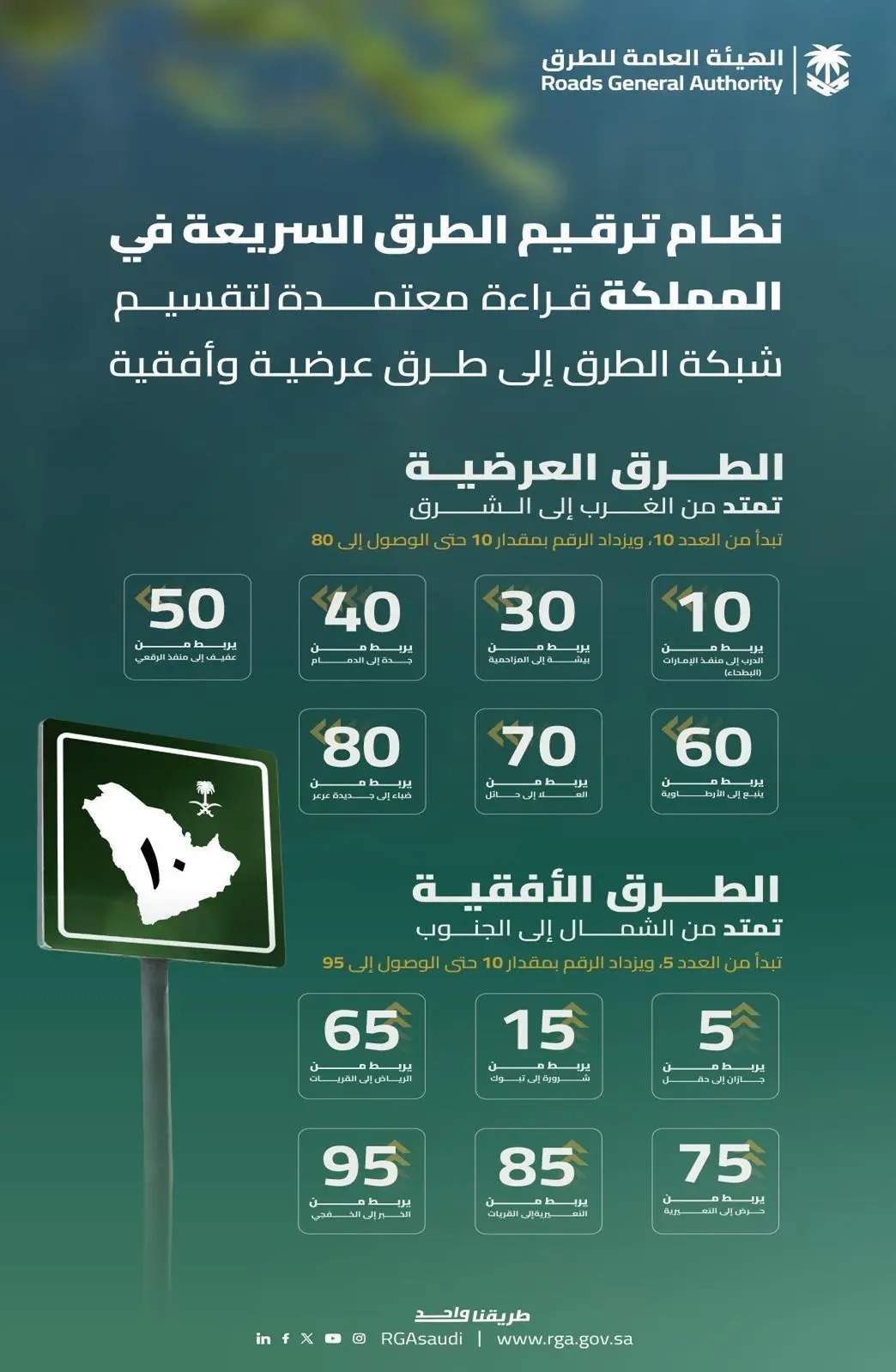 أوضحت الهيئة العامة للطرق نظام ترقيم الطرق السريعة في المملكة، مشيرةً إلى أنه يعتمد على تقسيم معتمد يصنّف الطرق إلى عرضية وطولية. ويسهم هذا النظام في تخطيط الطرق، وتحديد اتجاهاتها واحتياجاتها، وتعزيز الربط بين المدن، لضمان سلامة مستخدميها، وتوفير تجربة قيادة متميزة.