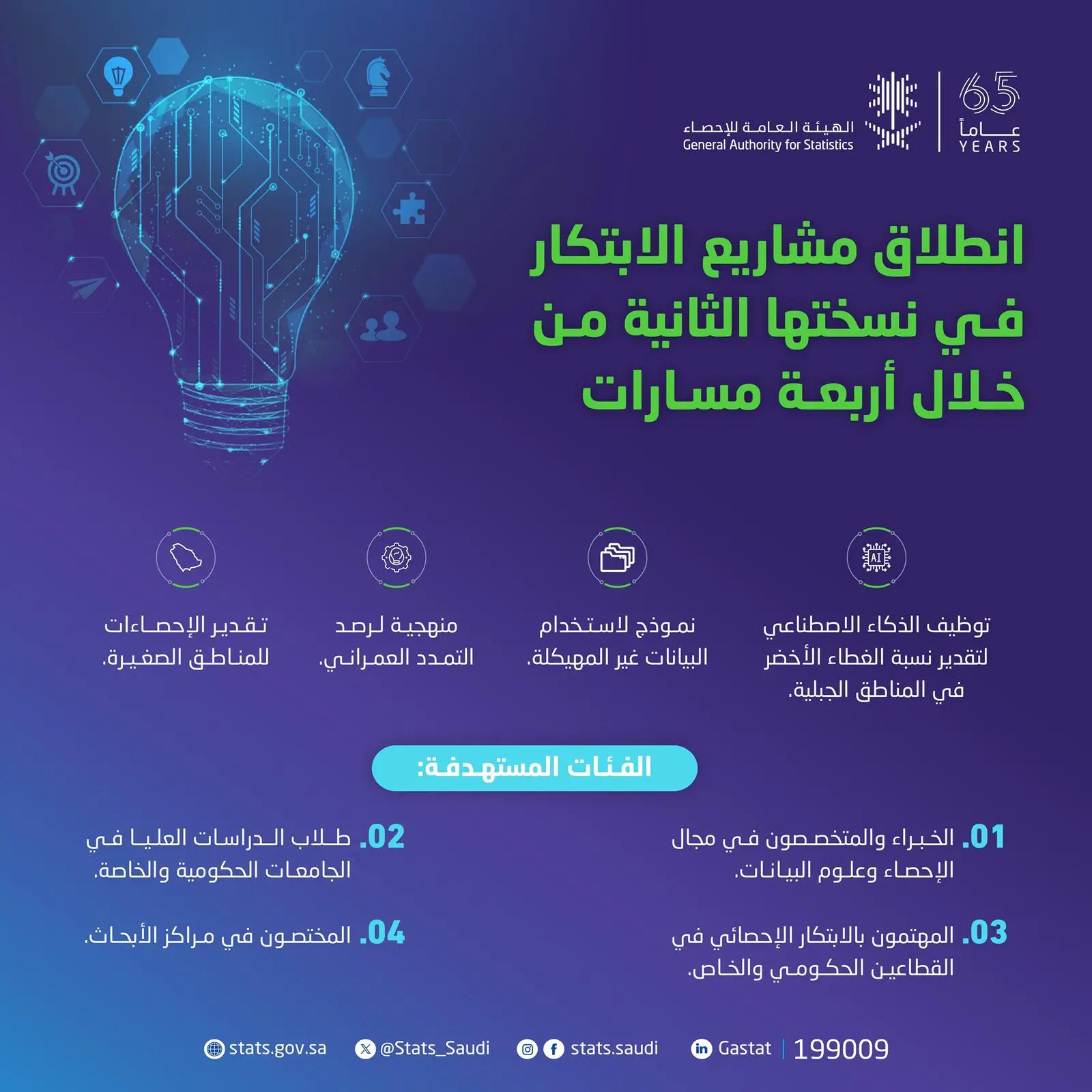 ودعت الهيئة العامة للإحصاء الراغبين في التقدم على المشاريع المطروحة للاطلاع على جميع التفاصيل وآلية المشاركة من خلال البوابة الإلكترونية (منصة الابتكار الإحصائي) عبر زيارة الرابط التالي: (https://www.stats.gov.sa/innovation-platform)، مشيرة إلى ترحيبها بجميع الاستفسارات وطلب المعلومات من خلال التواصل مع ممثليها بالاتصال على الرقم الموحَّد للهاتف الإحصائي (199009)، أو عبر البريد الإلكتروني لدعم العملاء (info@stats.gov.sa)، أو البريد الإلكتروني لمختبر الابتكار (innovationlab@stats.gov.sa).