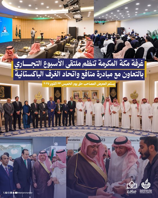نظمت غرفة مكة المكرمة بالتعاون مع مبادرة “منافع”، واتحاد الغرف الباكستانية اليوم، فعالية “ملتقى الأسبوع التجاري”، في إطار جهودها المستمرة لتعزيز العلاقات التجارية الدولية؛ وتهدف إلى تعزيز أواصر التعاون بين المملكة وجمهورية باكستان، وتوفير منصة مثالية لتبادل الأفكار والفرص الاستثمارية.