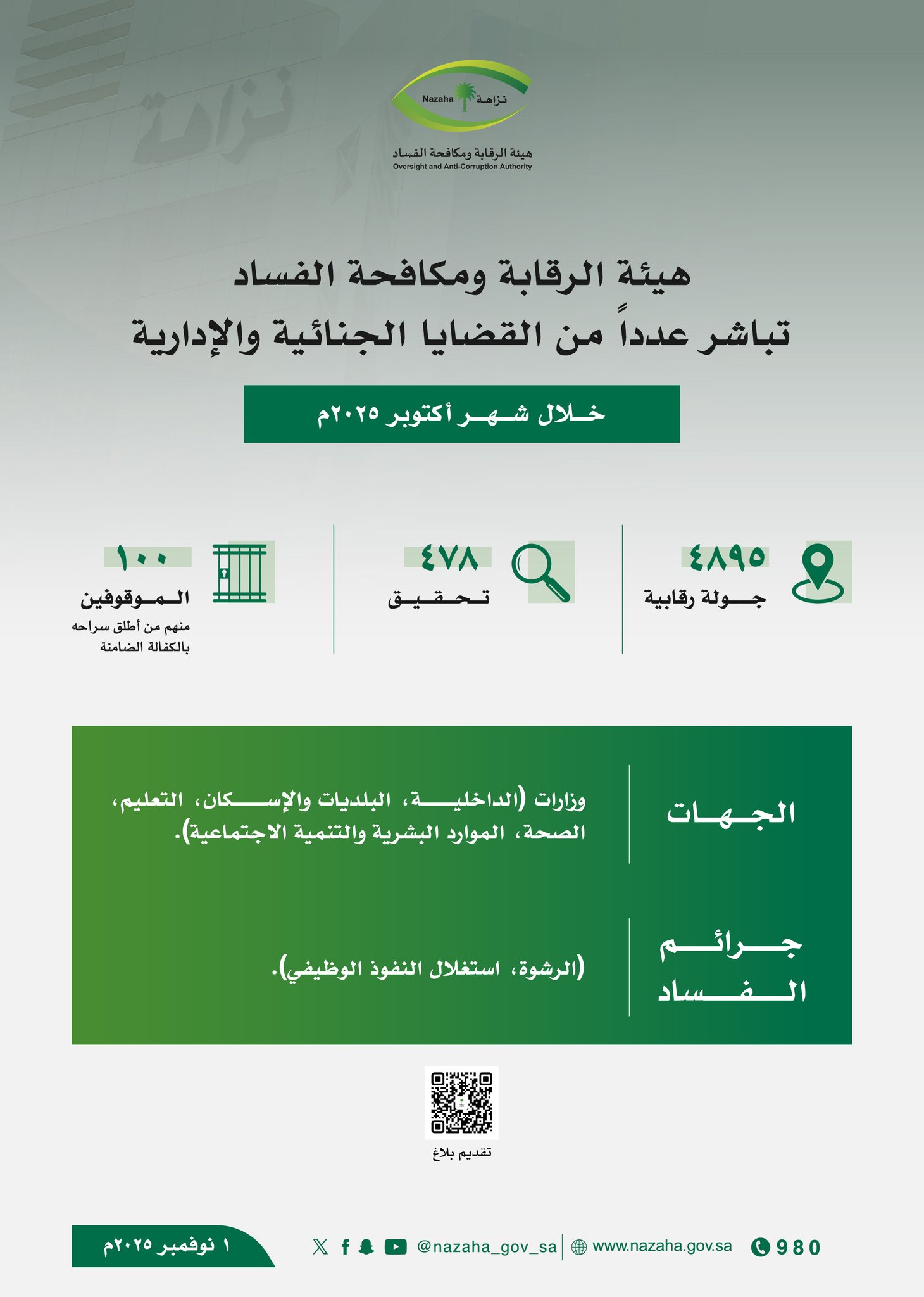 أعلنت هيئة الرقابة ومكافحة الفساد (نزاهة) مباشرتها عددًا من القضايا الجنائية والإدارية خلال شهر أكتوبر 2025، ضمن جهودها المستمرة لتعزيز مبادئ الشفافية والنزاهة في مختلف الجهات الحكومية.