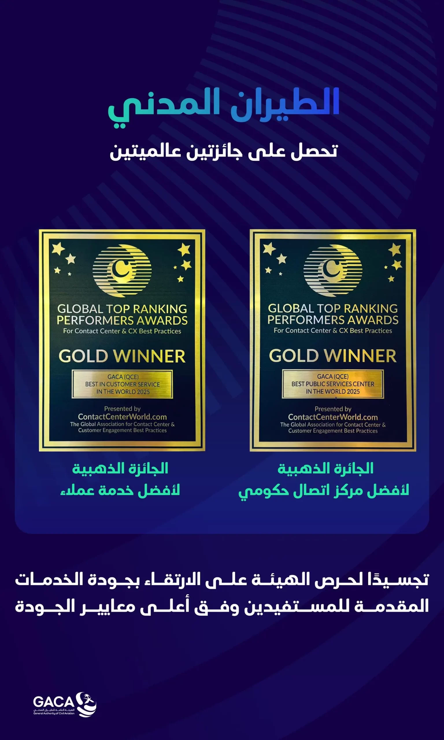 هيئة الطيران المدني تحصد جائزتين ذهبيتين “أفضل مركز اتصال حكومي” و”أفضل خدمة عملاء” على مستوى العالم