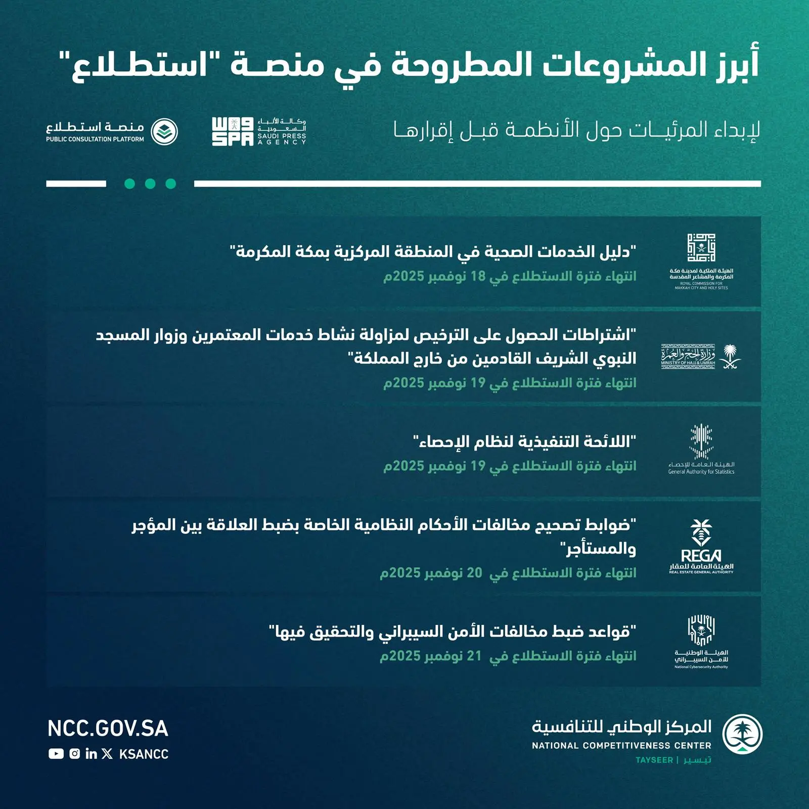 من جانبها طرحت وزارة الحج والعمرة عبر المنصة مشروع (اشتراطات الحصول على الترخيص لمزاولة نشاط خدمات المعتمرين وزوار المسجد النبوي الشريف القادمين من خارج المملكة)؛ بهدف تحديد المتطلبات والشروط اللازمة للحصول على ترخيص مزاولة نشاط تقديم الخدمات للمعتمرين وزوار المسجد النبوي الشريف القادمين من خارج المملكة، بما يضمن جودة الخدمات المقدمة، ويحفظ حقوق المستفيدين، ويرفع كفاءة المنشآت العاملة في المجال، وينتهي الاستطلاع على المشروع بتاريخ 19 نوفمبر 2025م.