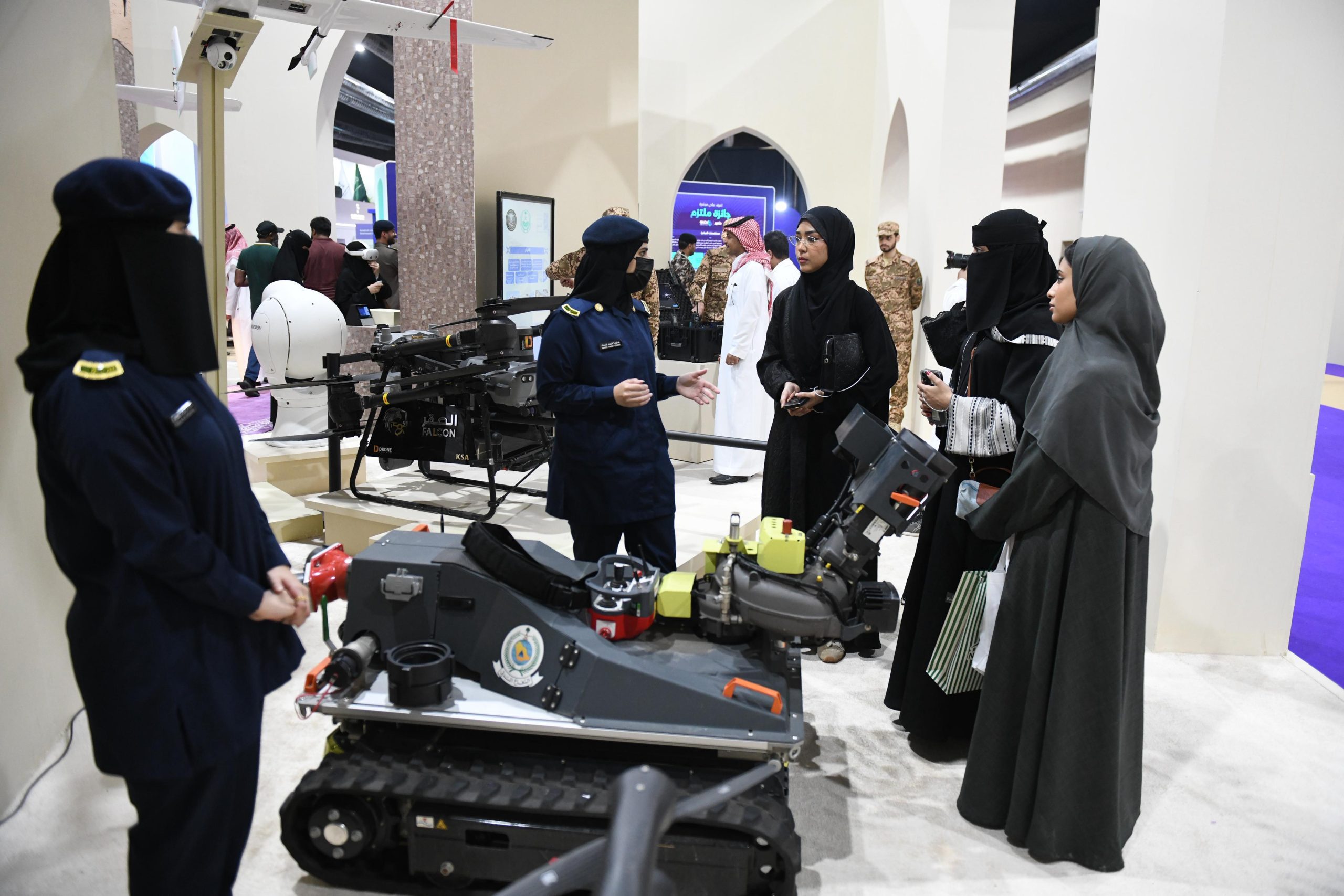 واطلع زوار الجناح على حلول الدفاع المدني الذكية في أعماله الميدانية، التي تشمل نظام مراقبة المشاعر، والمنصة الوطنية للإنذار المبكر، وبوابة سلامة الإلكترونية، وطائرة الدرون (الصقر) المخصصة لأعمال الإطفاء في المواقع المرتفعة والمناطق الخطيرة، والطائرة دون طيار المجهزة للكشف عن المواد الكيميائية والإشعاعية، وروبوت مكافحة الحرائق المستخدم في المهام الصعبة، وتجهيزات فريق البحث والإنقاذ السعودي.