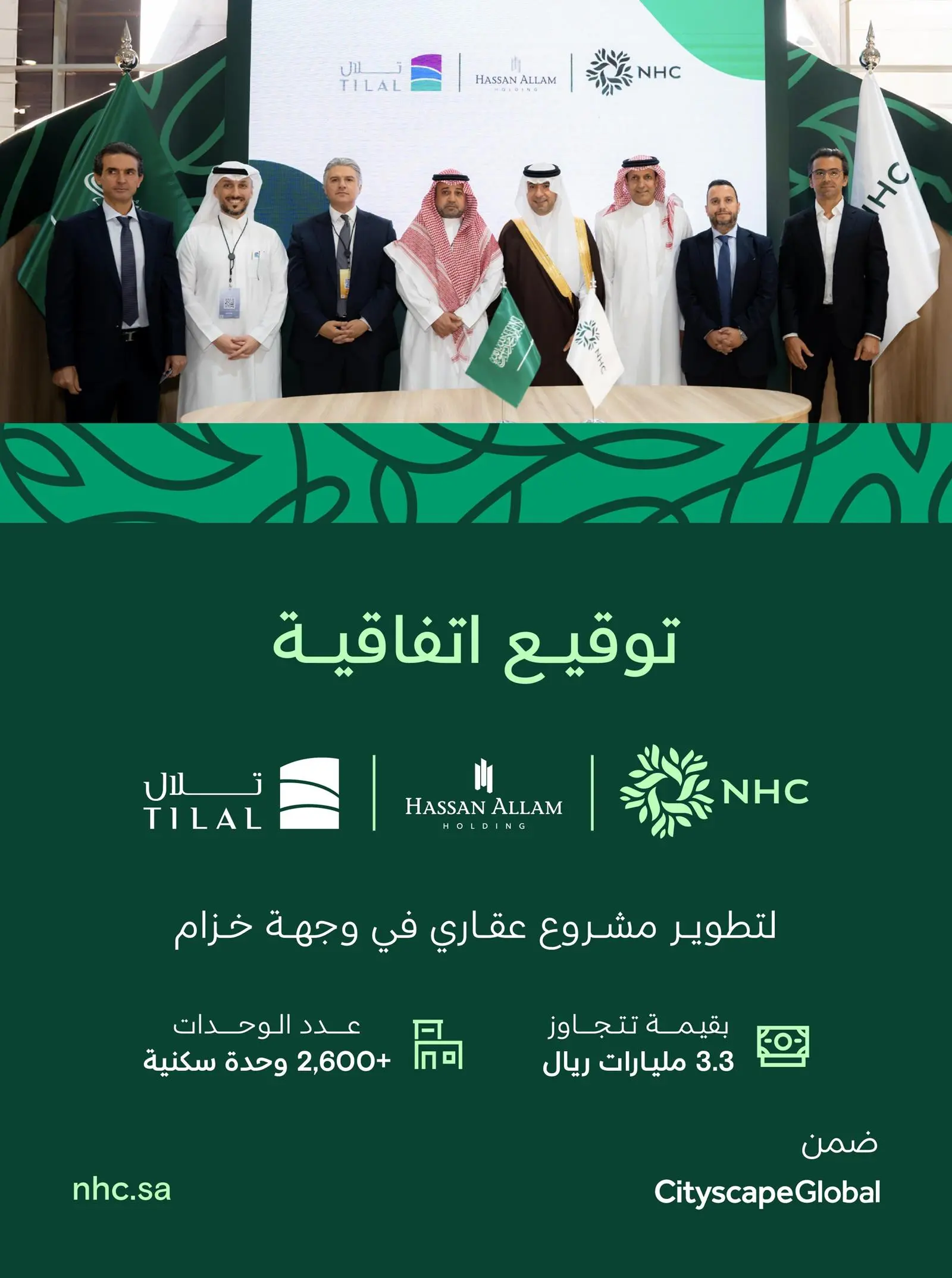 برعاية معالي وزير البلديات والإسكان الأستاذ ماجد بن عبدالله الحقيل، وقّعت NHC اتفاقية تطوير عقاري سكني مع شركة حسن علام للتطوير العمراني، لتطوير مشروع عقاري متكامل يتضمن مكونات تجارية ومتعددة الاستخدامات في وجهة خزام شمال الرياض، وبقيمة استثمارية تتجاوز 3 مليارات ريال، وذلك على هامش مشاركتها شريكًا مؤسسًا في معرض سيتي سكيب العالمي 2025.