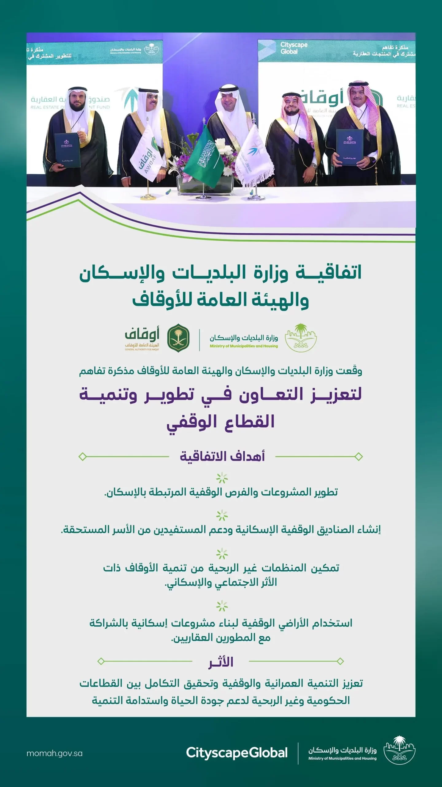 ويأتي توقيع المذكرة في إطار حرص وزارة البلديات والإسكان على تفعيل الشراكات الإستراتيجية مع الجهات الحكومية والقطاع غير الربحي، لدعم التنمية العمرانية والوقفية، وتحقيق التكامل بين القطاعات بما يسهم في تعزيز جودة الحياة واستدامة التنمية في مختلف مناطق المملكة.