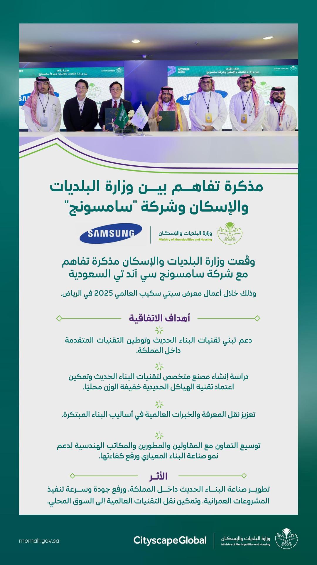 وقّعت وزارة البلديات والإسكان مذكرة تفاهم مع شركة سامسونج سي آند تي السعودية، ضمن فعاليات معرض “سيتي سكيب العالمي 2025” الذي تستضيفه مدينة الرياض خلال الفترة من 17 إلى 20 نوفمبر الجاري، بمشاركة محلية ودولية واسعة في قطاع التطوير العقاري والإنشاءات.