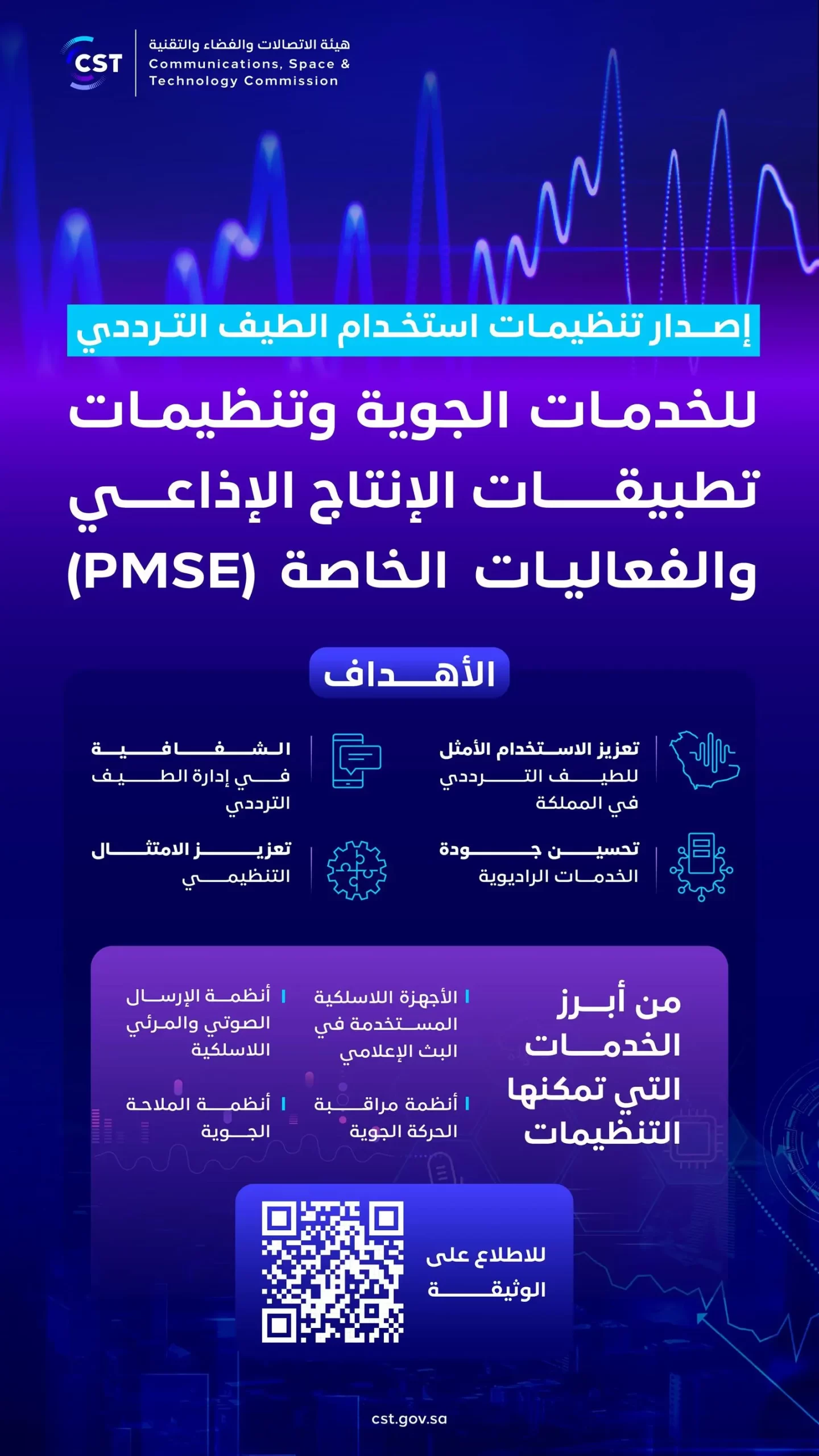 وأضافت أن “تنظيمات استخدام الطيف الترددي لتطبيقات الإنتاج الإذاعي والفعاليات الخاصة (PMSE)” تنظم استخدام الطيف الترددي بالتنسيق مع الجهات ذات العلاقة لتشغيل الميكروفونات اللاسلكية، وأنظمة الإرسال الصوتي والمرئي اللاسلكية، وأنظمة التحكم عن بعد، والكاميرات اللاسلكية، والأجهزة اللاسلكية المستخدمة في البث الإعلامي، والتغطيات التلفزيونية، والعروض الحية، والمناسبات الثقافية والدينية، والفعاليات الرياضية والترفيهية، إضافة إلى الاستخدامات في أستوديوهات الإذاعة والتلفزيون، والمؤسسات التعليمية، وقاعات الاجتماعات، والمسارح، وغيرها من الأجهزة المستخدمة في الإنتاج الإذاعي والفعاليات الخاصة