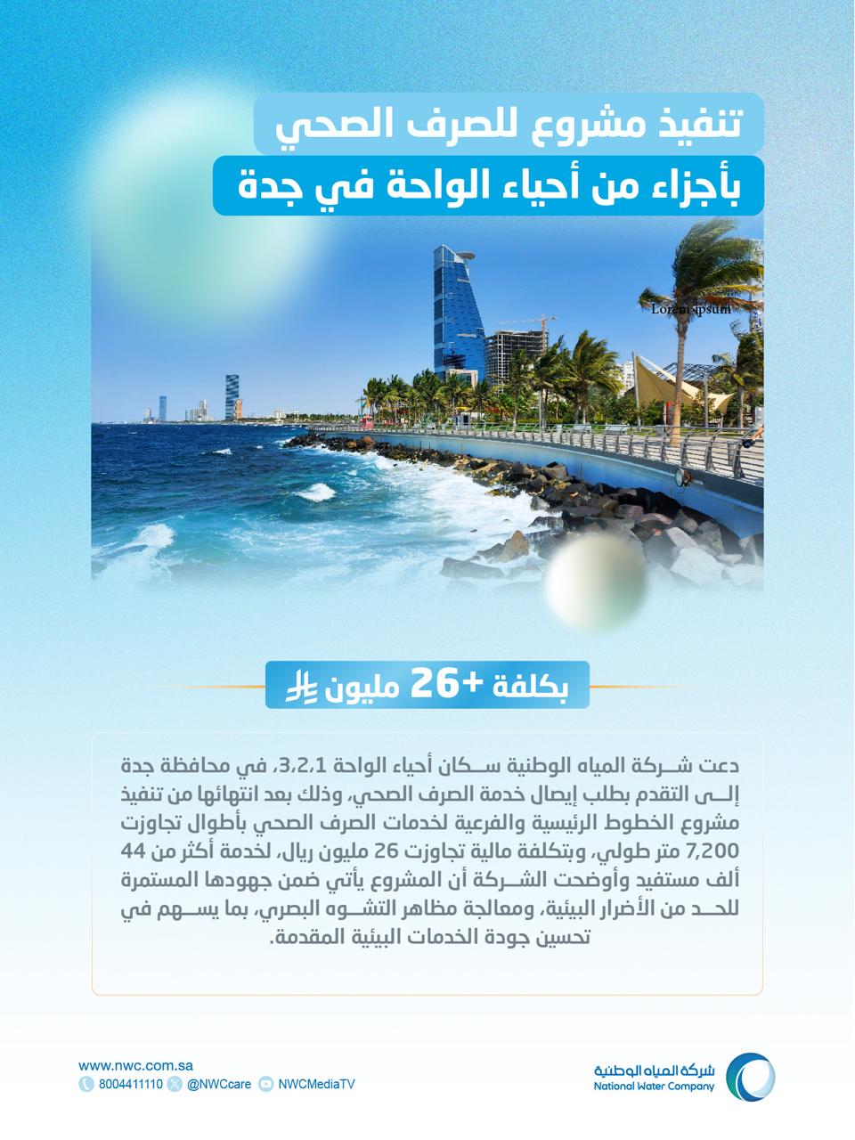 وأشارت الشركة إلى بدء استقبال طلبات إيصال خدمة الصرف الصحي من سكان الأحياء المستفيدة (الواحة 1، 2، 3)، وذلك عبر الفرع الإلكتروني على الرابط (e.nwc.com.sa)، أو من خلال التواصل عبر الرقم الموحد لخدمة العملاء (8004411110)، أو عبر قنواتها الرقمية المختلفة، مؤكدةً أهمية التأكد من إرفاق جميع المستندات والبيانات المطلوبة لضمان اكتمال الطلب.