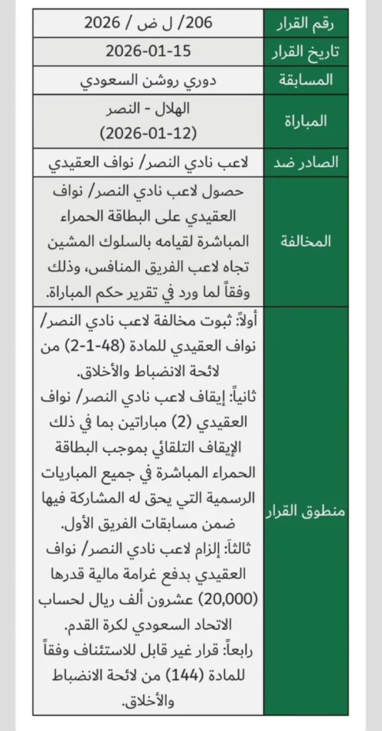 وأوضحت اللجنة في بيانها الرسمي أن العقوبة استندت إلى المادة (48-1-2) من لائحة الانضباط والأخلاق، بعد حصول العقيدي على بطاقة حمراء مباشرة نتيجة سلوك مشين تجاه لاعب الهلال البرتغالي روبن نيفيز، مشيرة إلى أن القرار بُني على تقرير حكم المباراة الفرنسي، الذي أكد وقوع حادثة ضرب من دون كرة.