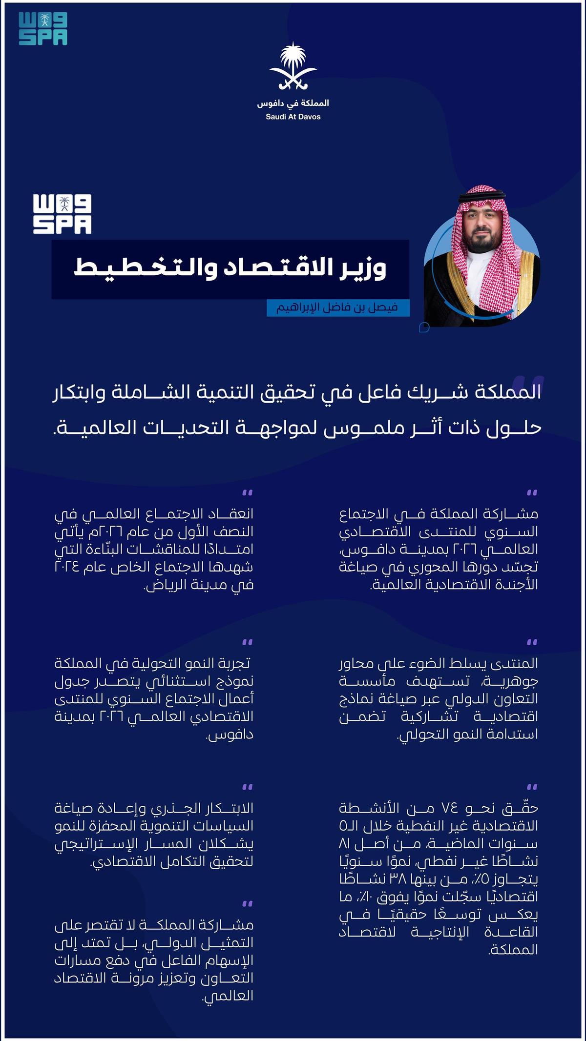 أكّد معالي وزير الاقتصاد والتخطيط الأستاذ فيصل بن فاضل الإبراهيم، أنّ مشاركة المملكة في الاجتماع السنوي للمنتدى الاقتصادي العالمي 2026 بمدينة دافوس، تجسّد دورها المحوري في صياغة الأجندة الاقتصادية العالمية, انطلاقًا من تجربتها التحولية ضمن رؤية المملكة 2030، واستكمالًا لجهودها كونها شريكًا فاعلًا في تحقيق التنمية الشاملة وابتكار حلول ذات أثر ملموس لمواجهة التحديات العالمية، بما يضمن استدامة النمو والازدهار على الصعيد المحلي والإقليمي والدولي.