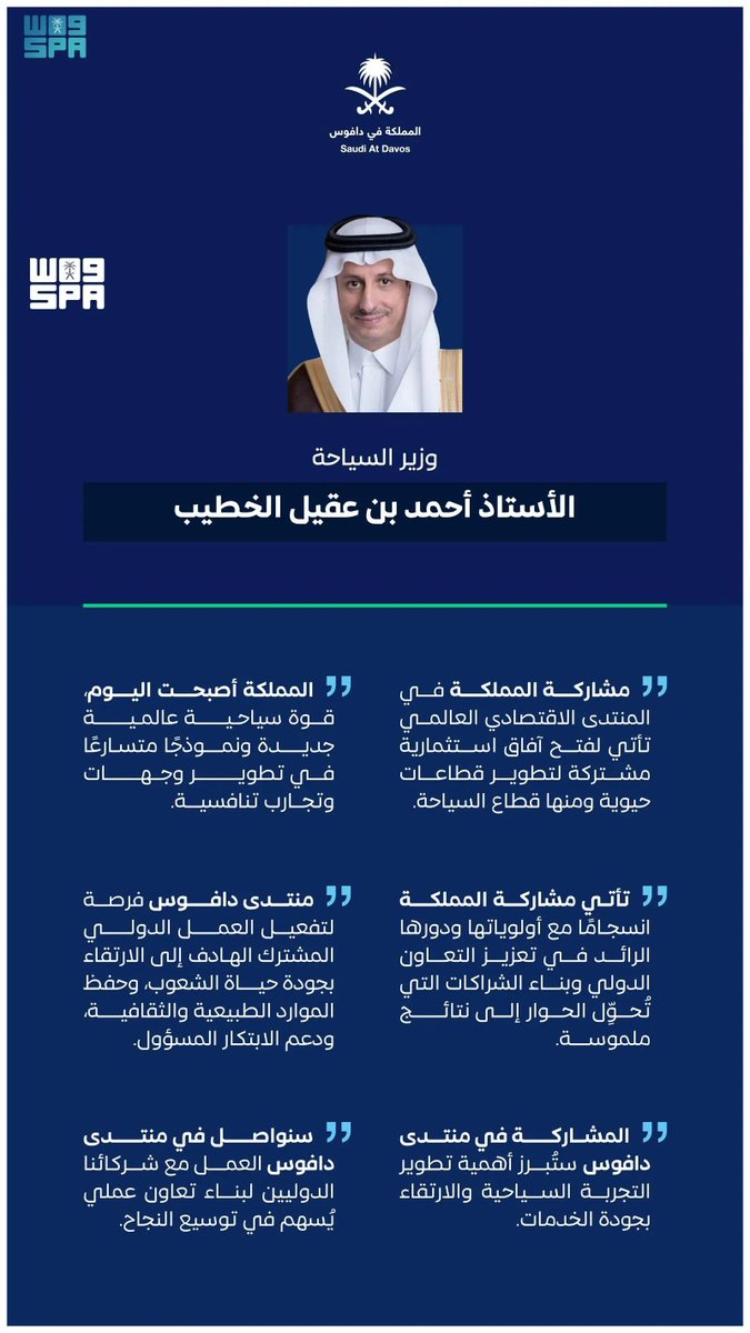 أكد معالي وزير السياحة الأستاذ أحمد بن عقيل الخطيب، أن مشاركة وفد المملكة العربية السعودية في المنتدى الاقتصادي العالمي 2026 في دافوس، تأتي انسجامًا مع أولوياتها ودورها الرائد في تعزيز التعاون الدولي وبناء الشراكات التي تُحوِّل الحوار إلى نتائج ملموسة.