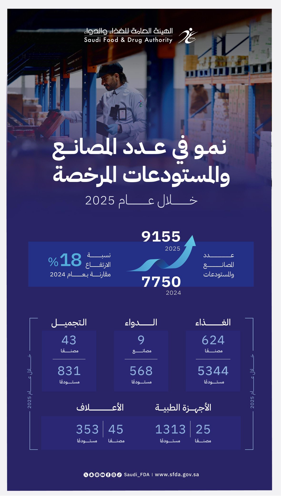 سجّلت الهيئة العامة للغذاء والدواء نموًا ملحوظًا في عدد المصانع والمستودعات المرخصة خلال عام 2025م، بنسبة بلغت 18% مقارنة بعام 2024م، بما يُجسد تطور البيئة التنظيمية ودعم الاستثمارات في المجالات الخاضعة لإشراف الهيئة.