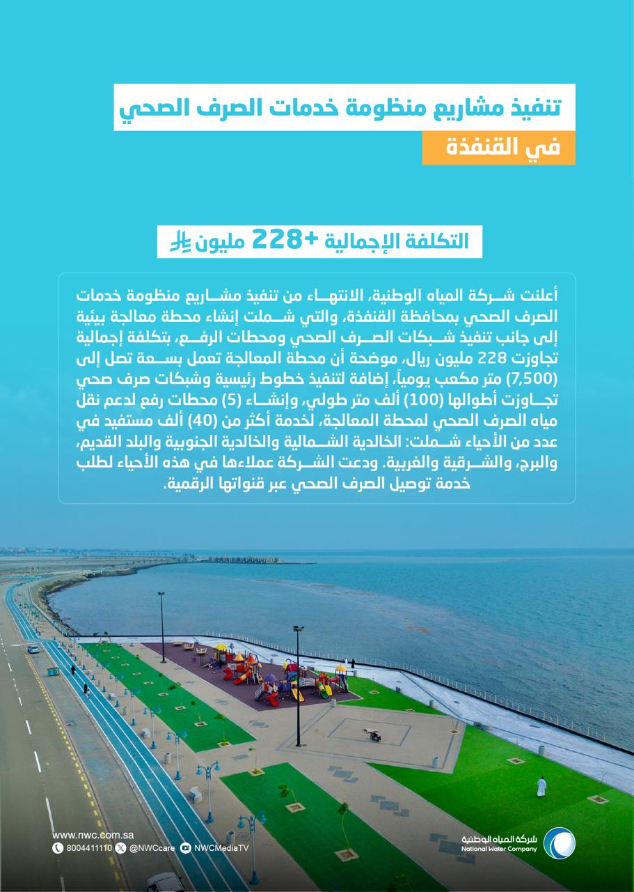 أعلنت شركة المياه الوطنية، عن الانتهاء من تنفيذ مشاريع منظومة خدمات الصرف الصحي بمحافظة القنفذة، والتي شملت إنشاء محطة معالجة بيئية إلى جانب تنفيذ شبكات الصرف الصحي ومحطات الرفع، وذلك بتكلفة إجمالية تجاوزت (228) مليون ريال. ويأتي ذلك ضمن مشاريع الخدمات البيئية الرامية إلى تحسين جودة الحياة والارتقاء بالبنية التحتية ضمن مستهدفات رؤية المملكة 2030.