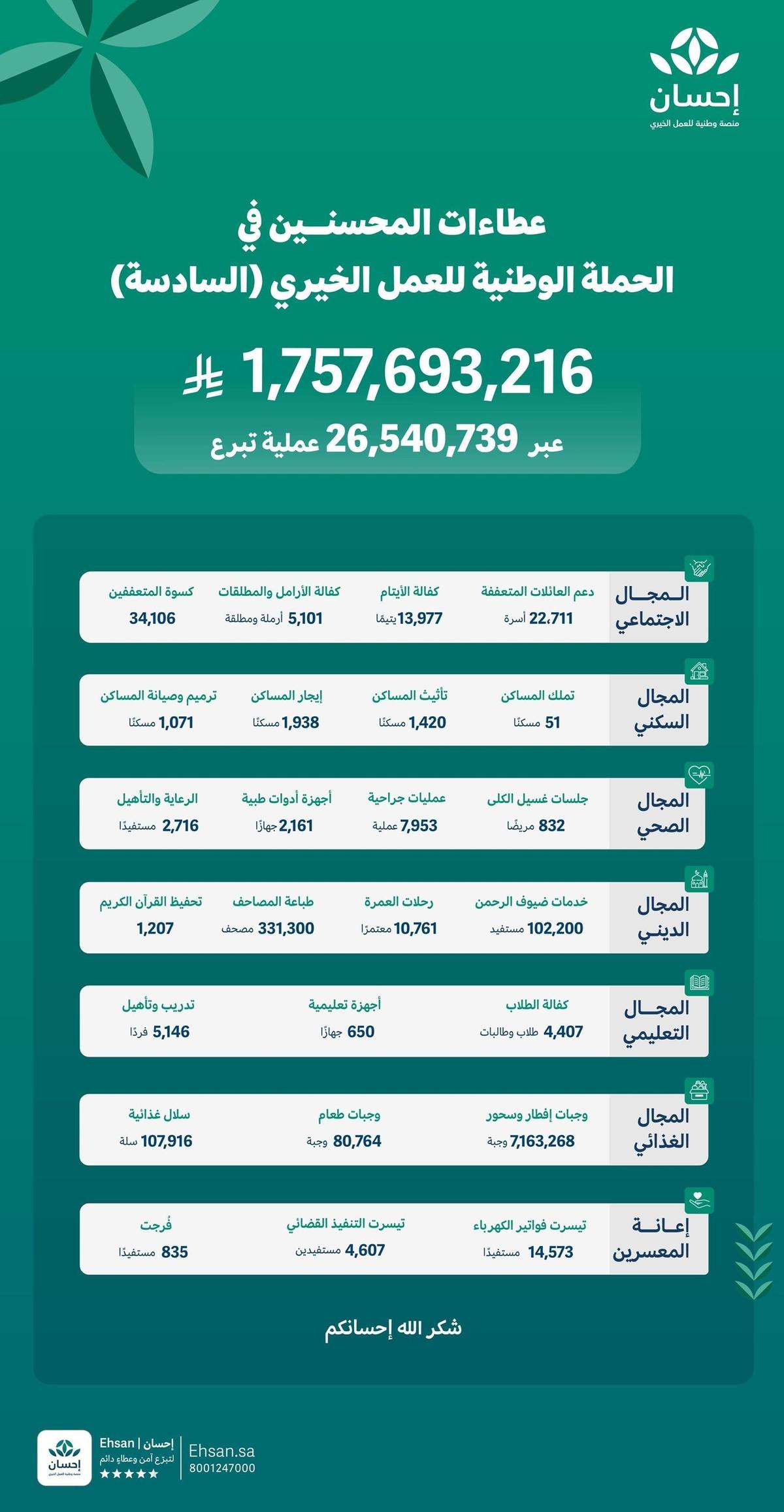 آخر الأخبار > تبرعات الحملة الوطنية للعمل الخيري بنسختها السادسة عبر منصة “إحسان” تتجاوز 1.757 مليار ريال