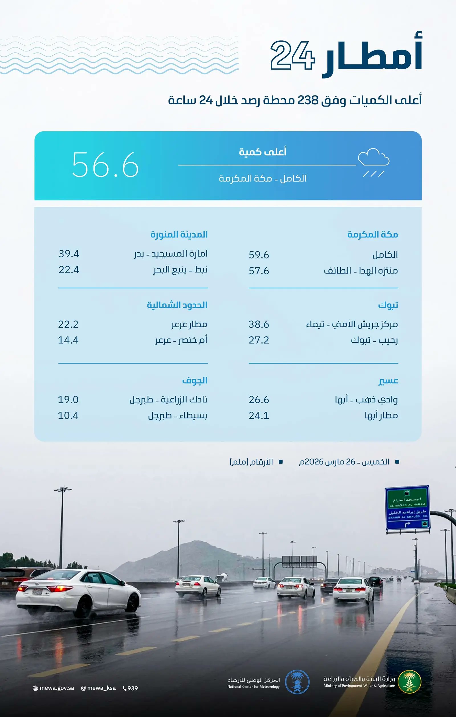 شهدت 11 منطقة في المملكة خلال الأربع والعشرين ساعة الماضية هطول أمطار تراوحت بين الغزيرة والخفيفة، حيث سجّلت محطة رصد الكامل بمنطقة مكة المكرمة أعلى كمية بلغت 59.6 ملم، فيما سجلت محطة منتزه الهدا بالطائف 57.6 ملم، ومحطة الشفا بالطائف 44.3 ملم، في حين سجلت محطة الريان بالجموم 42.8 ملم، ومحطة إمارة المسيجيد بمحافظة بدر في المدينة المنورة 39.4 ملم.